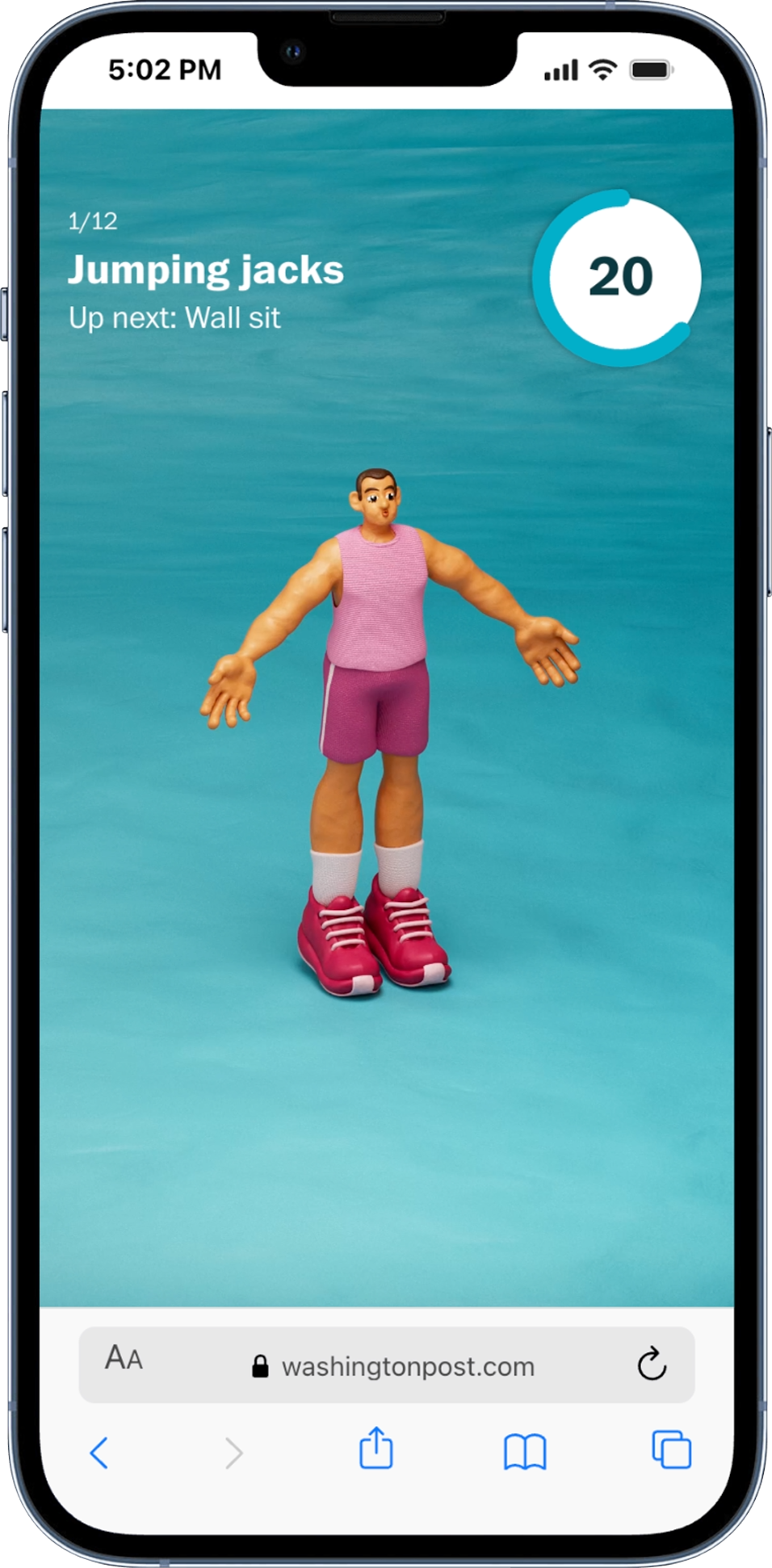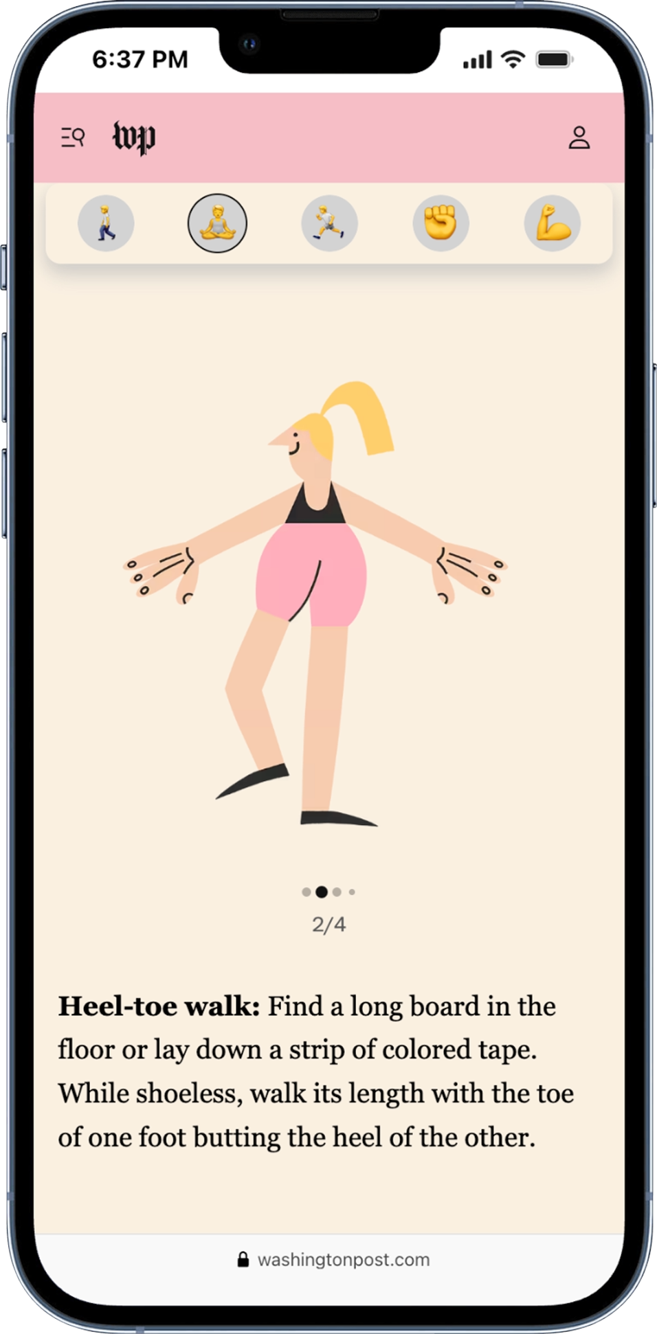 This was a four-part series featuring animated workout videos. We experimented with ways of increasing engagement on the videos while making it easy to do the workout on (or off) the Post site.
